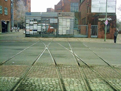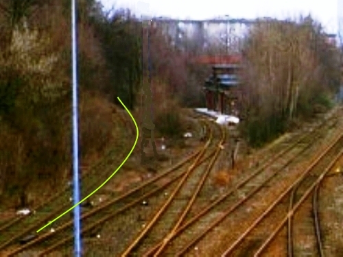 die Anschlussbahn schwenkt in Richtung Hussitenstraße, von der Hauptbahn ab