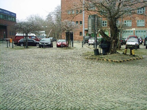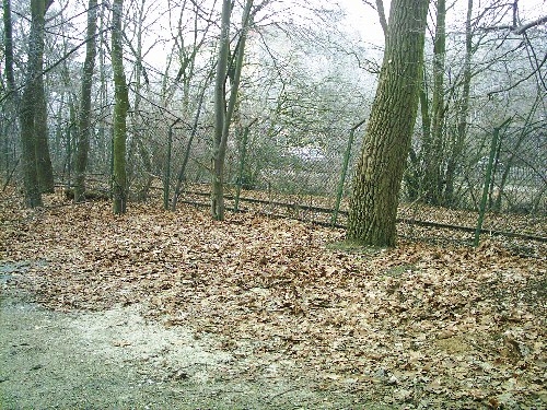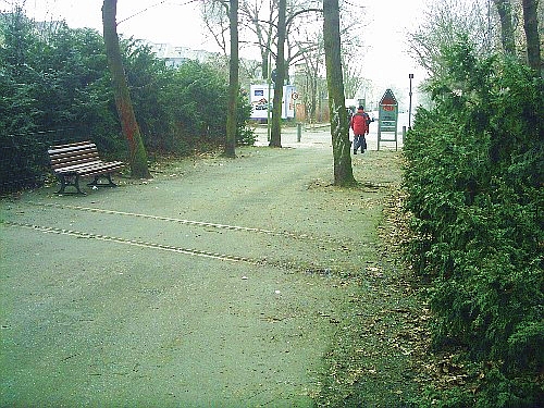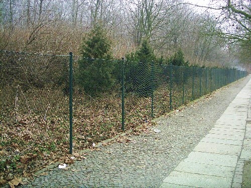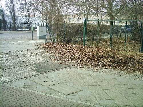 auf dem Gehweg Hussitenstraße, das Gleis lag hinter dem Zaun