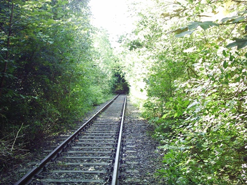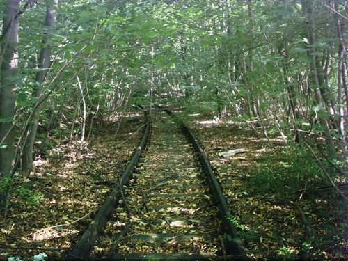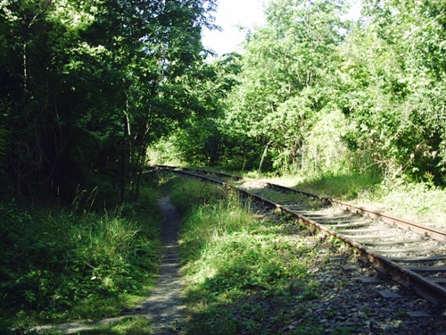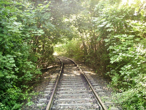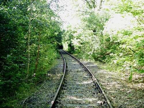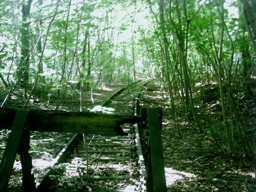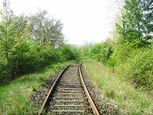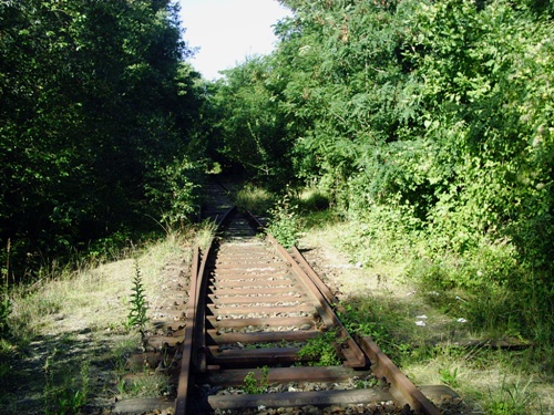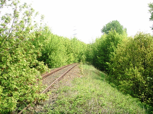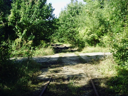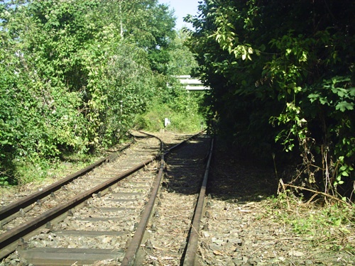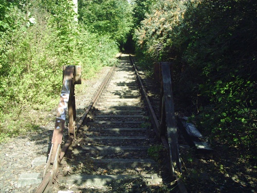 hinter der Kurve ein Prellbock, scheinbar wurde die Strecke Stück für Stück außer Betrieb genommen