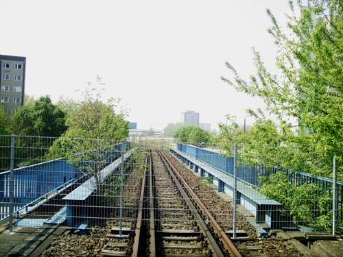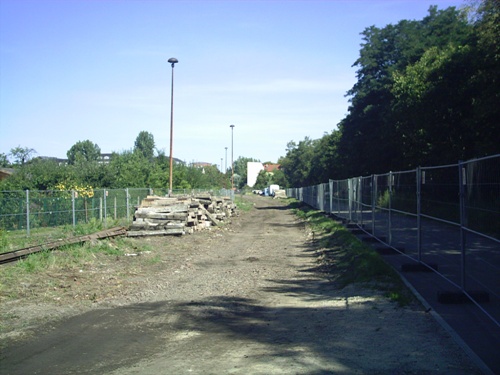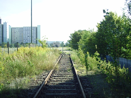 das Gleis zum Bhf Lichtenberg würde links von uns eine links Kurve machen, von der Trasse gib es keine Spuren mehr auf einer Länge von 300m