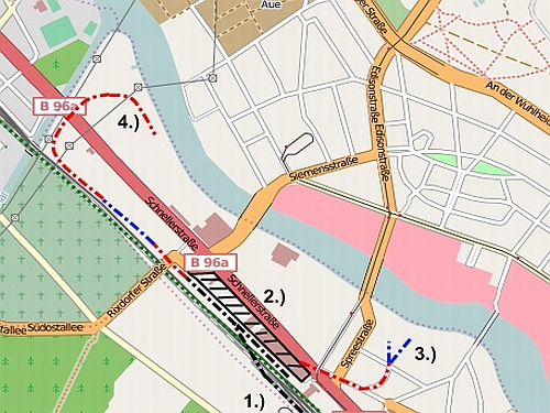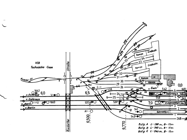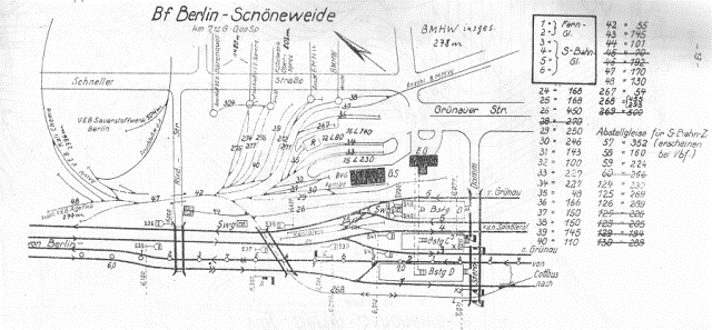1.) Bhf Schöneweide, 2.) Ortsgüterbahnhof Schöneweide, 3.) Anschlussgleis Flutstraße, 4.) Anschlussgleis VEB Kali Chemie