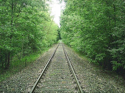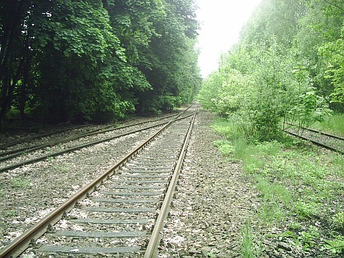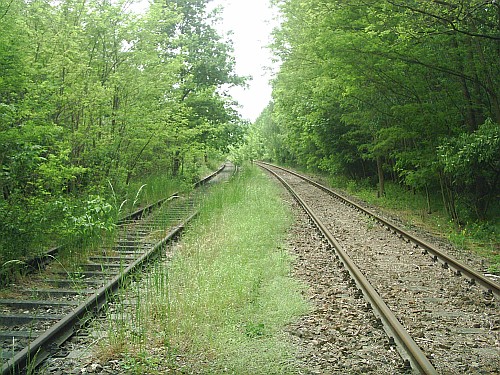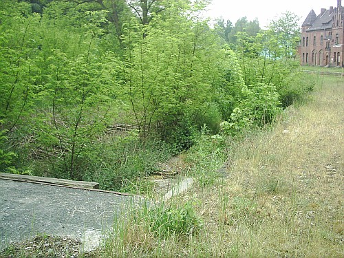 rechts das Hauptgleis, links die 3 Gleise stark bewachsen