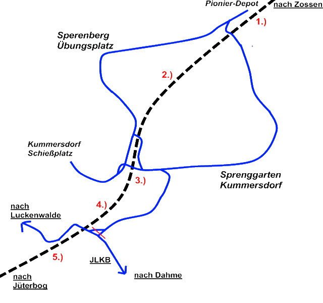 1.) Rehagen-Klausdorf, 2.) Sperenberg, 3.) Kummersdorf Gut, 4.) Schönefeld bei Luckenwalde, 5.) Jänickendorf