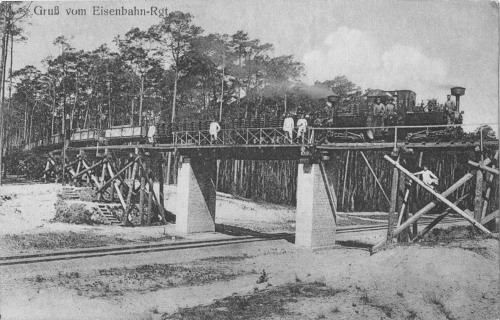 jetzt kurz vor Kummersdorf Gut, die Feldbahn verlief dann parallel mit der Nebenbahn Zossen-Jüterbog bzw. Militärbahn nach Kummersdorf Gut, die Brückenpfeiler sind von der kreuzenden Feldbahn Kummersdorf Gut - Sprenggarten ( Versuchsplatz ) - Rehagen bzw. die Rundstrecke