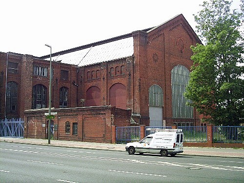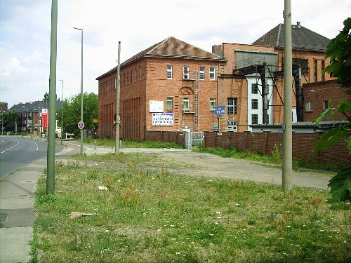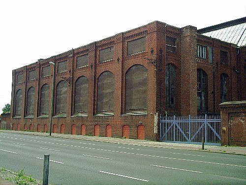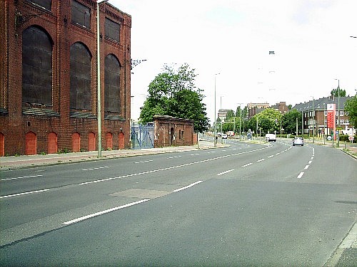 Blick über die Straßen auf die Toreinfahrt vom Kraftwerk