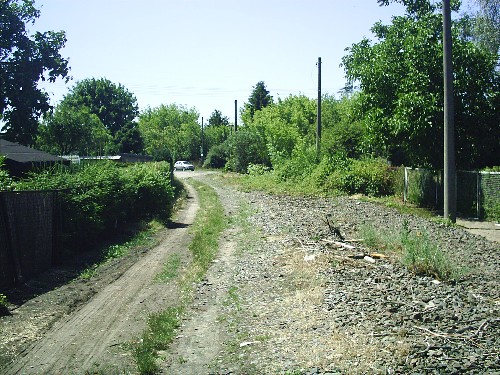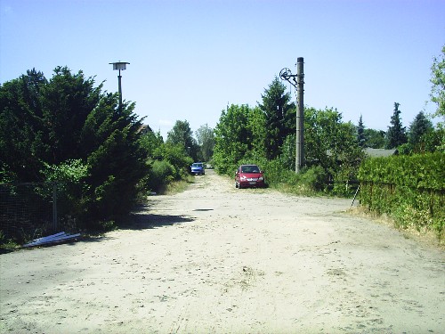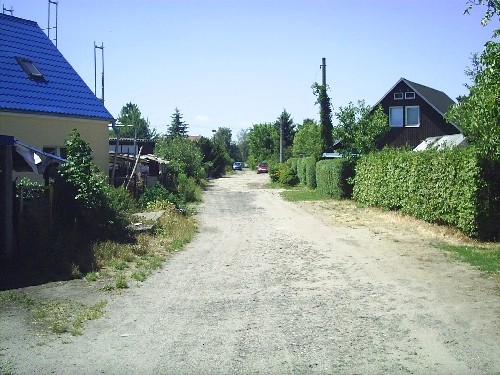 weiter durch die Gartenkolonie, Schotter von der Bahntrasse noch sichtbar