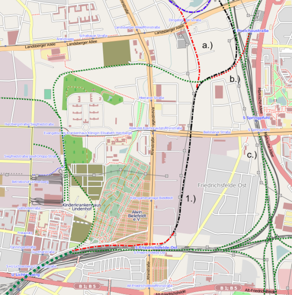 1.) Gbf Friedrichsfelde Magerviehhof, a.) Urzustand beim Bau der Industiebahn, b.) ehemalige Führung der Wriezener Bahn bis 1951, c.) ehemaliger Güteraußenring GAR bzw. ab 1951 Bereich umgebaut zum Berliner Außenring BAR