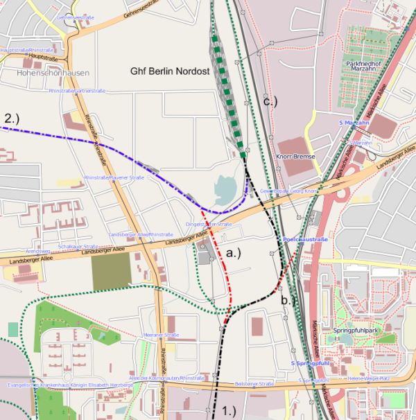 1.) Gbf Friedrichsfelde Magerviehhof, 2.) Gbf Hohenschönhausen, a.) Urzustand beim Bau der Industiebahn, b.) ehemalige Führung der Wriezener Bahn bis 1951 später über Biesdorfer Kreuz