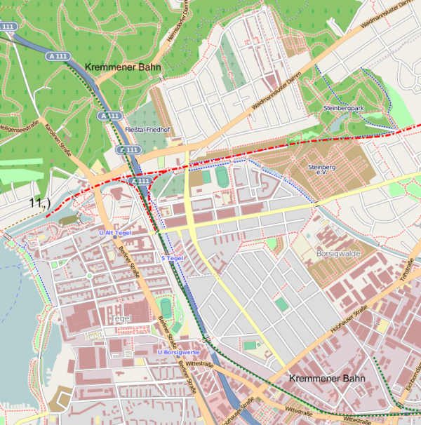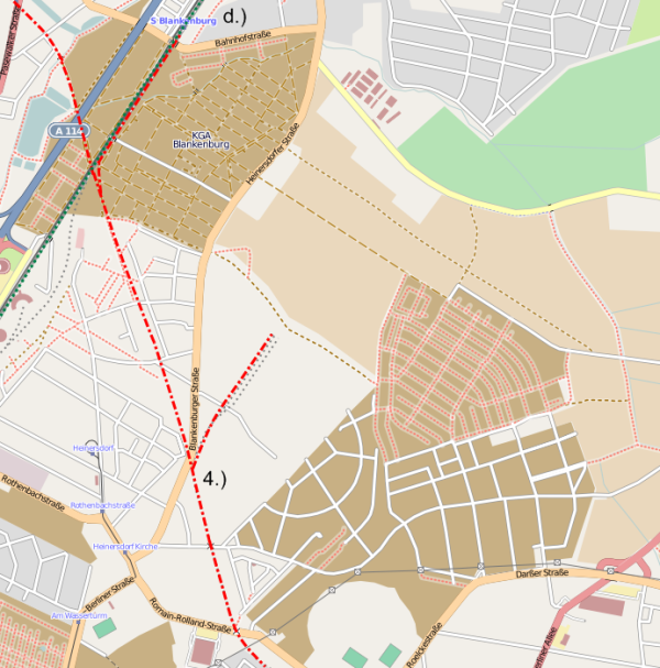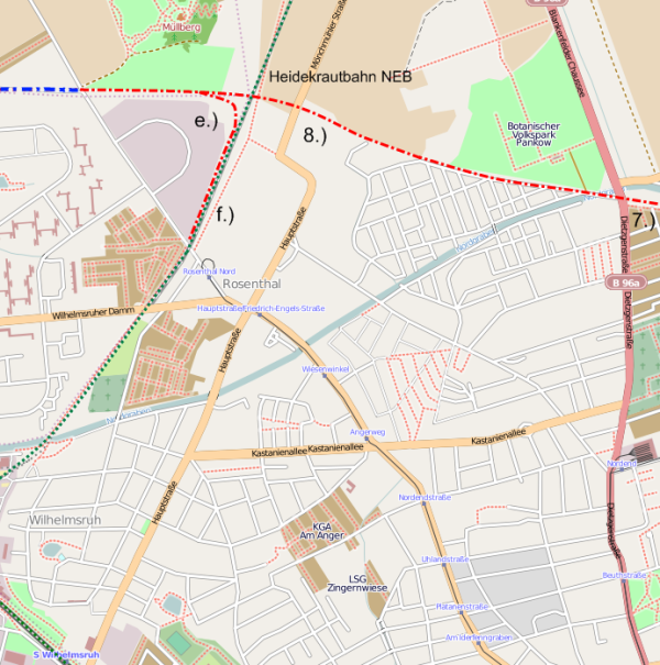 7.) Gbf Nordend, 8.) Rosenthal Nord, e.) Verbindungskurve zur Heidekrautbahn NEB, f.) Bhf Rosenthal