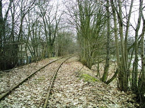 links das Gleis führt nach Schöneicher Plan, gerade ein Betriebsanschluss undvon rechts das Ende aus Richtung Brusendorf,Grenze der Bahnen Neukölln-Mittenwalder Eisenbahn