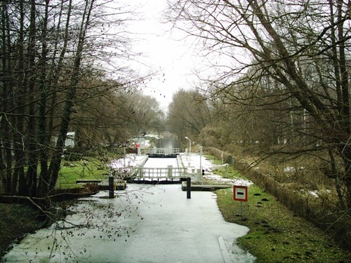 Blick von der Brücke, auf die Schleuse Mittenwalde