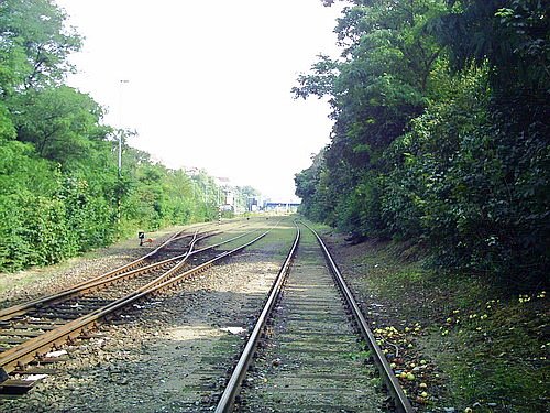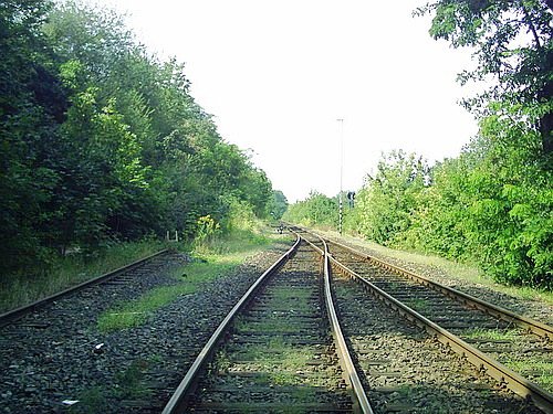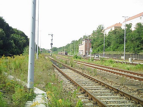 Rückblick von der Brücke Oderstraße, 2009 mit nur noch zwei Gleisen der Übergabegruppe