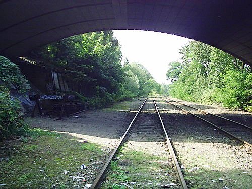 unter der Brücke Oderstraße, links das alte Gleis zum Flughafen, rechts das Streckengleis der NME Richtung Rudow