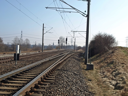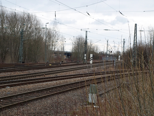 die beiden Gleise im Vordergrund nach Hagenbach, die zwei in der Mitte Richtung Karlsruhe und im Hintergrund zum Automobilwerk Wörth